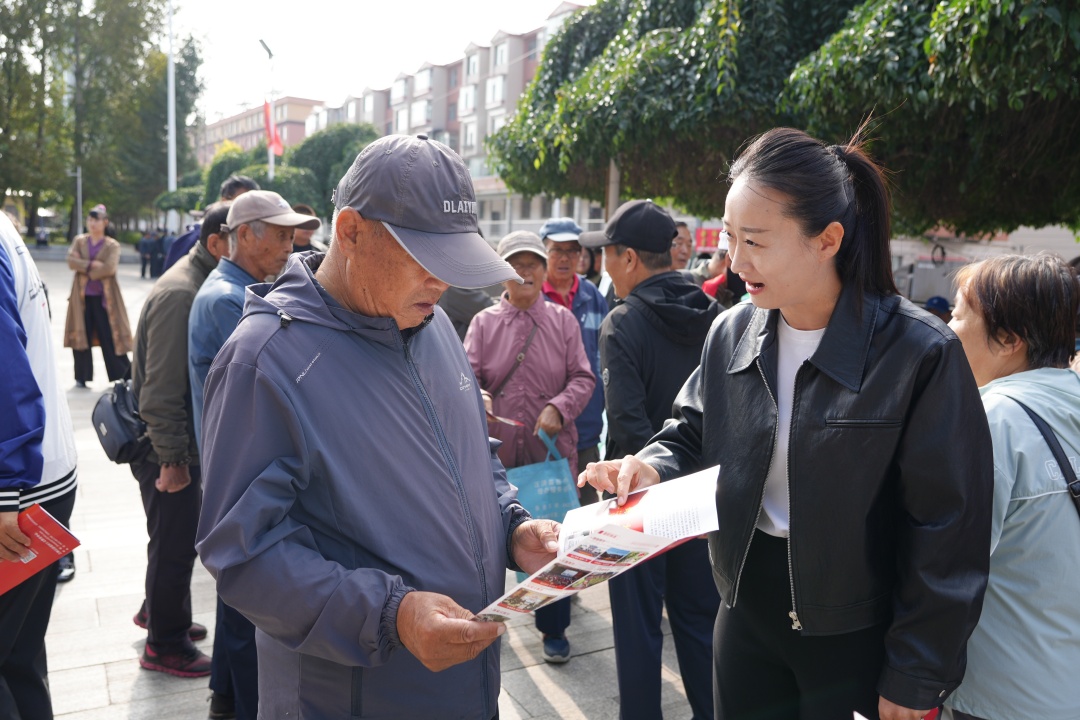 在滨河公园,工作人员向居民发放《吉林汪清爱国主义教育中心宣传册》和纪念品,设置“东满抗战历史纪念馆”主题展板,现场讲解抗战史与生态保护知识,居民反响热烈。