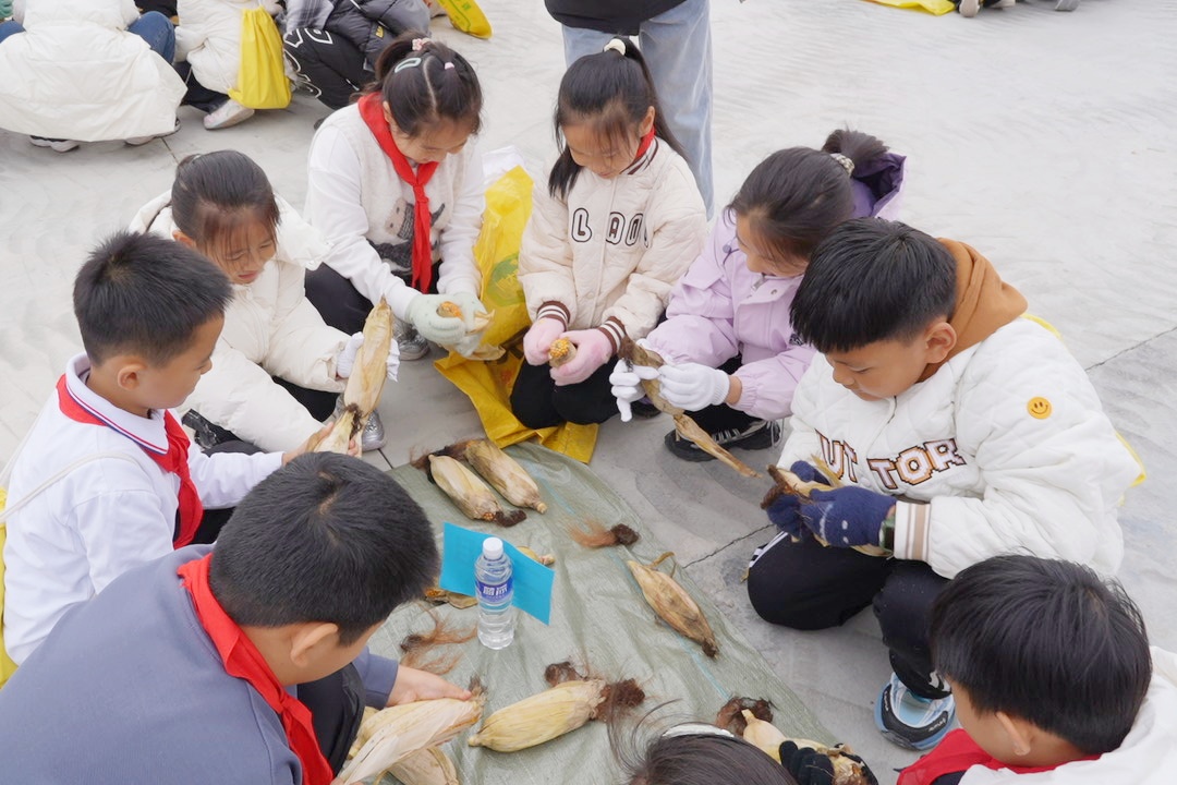 在明月沟村,同学们动手体验玉米脱粒,在汗水与泥土中记录“生态小发现”,体悟“一粥一饭来之不易”,加深对人与自然和谐共生的理解。
