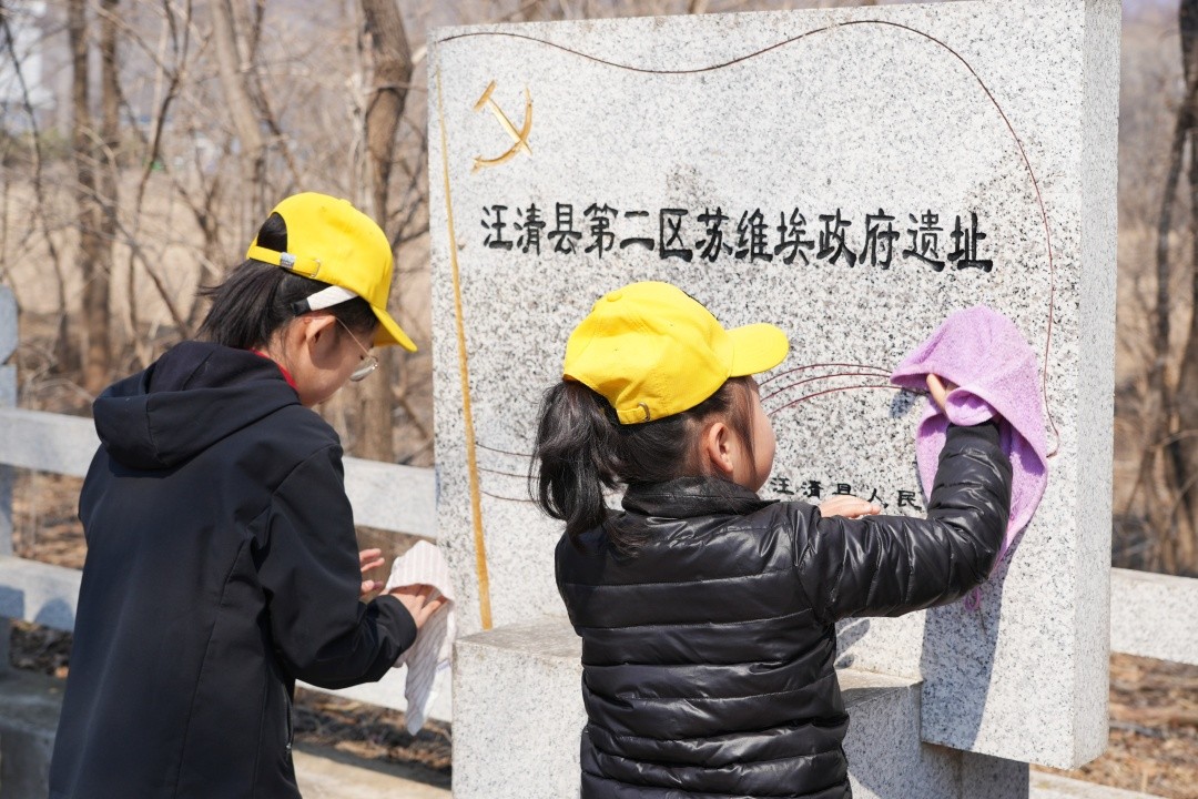 活动中,中心教师带领师生走进东满抗战历史纪念馆、小汪清抗日游击根据地聆听抗日少年英雄事迹、亲手制作追思花、擦拭烈士纪念碑,并完成献花默哀、宣誓祭扫、团队拓展等环节,让红色精神在实践中薪火相传。